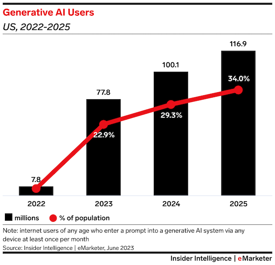 In the US, 100.1 million people will be generative AI users this year. That’s way up from 7.8 million just two years ago. As use climbs, expect potential uses of AI to become actual uses of AI.