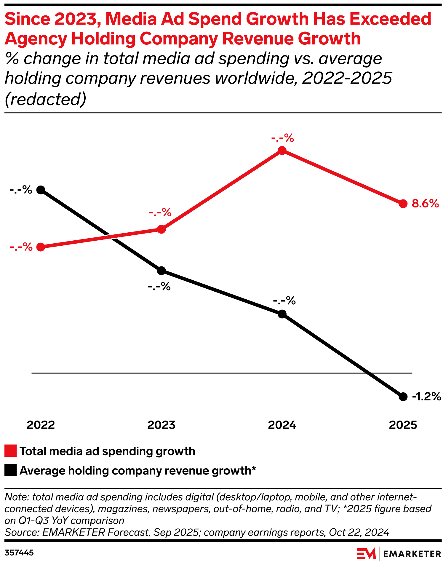 Key Stat: While worldwide ad spending grew by 8.6% YoY in 2025, holding company revenues fell by 1.2%.