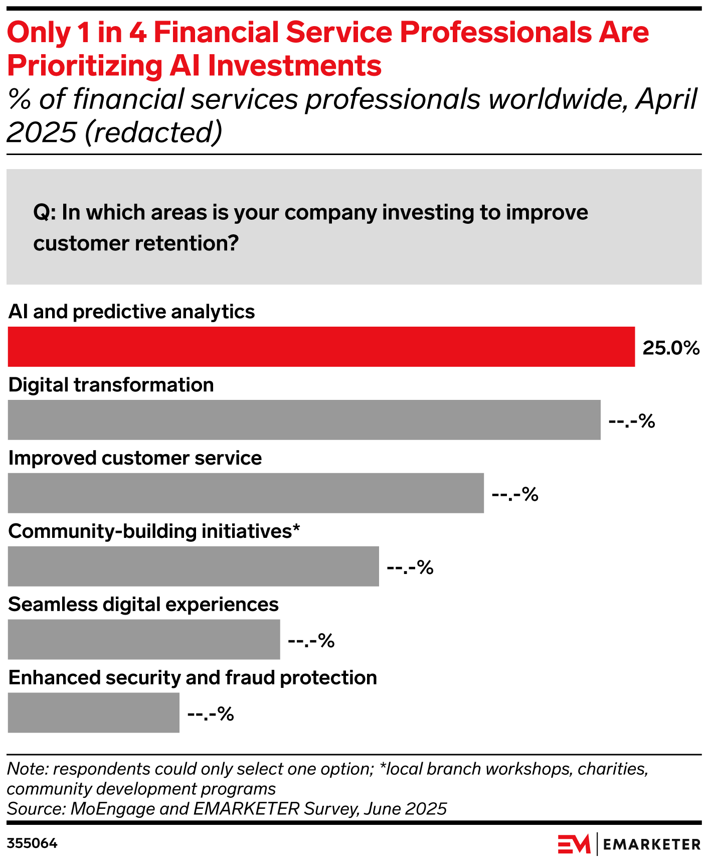 Key Stat: Only 25.0% of financial services professionals cited AI and predictive analytics as an area they’re investing in to improve customer retention, per our April 2025 survey in partnership with MoEngage.