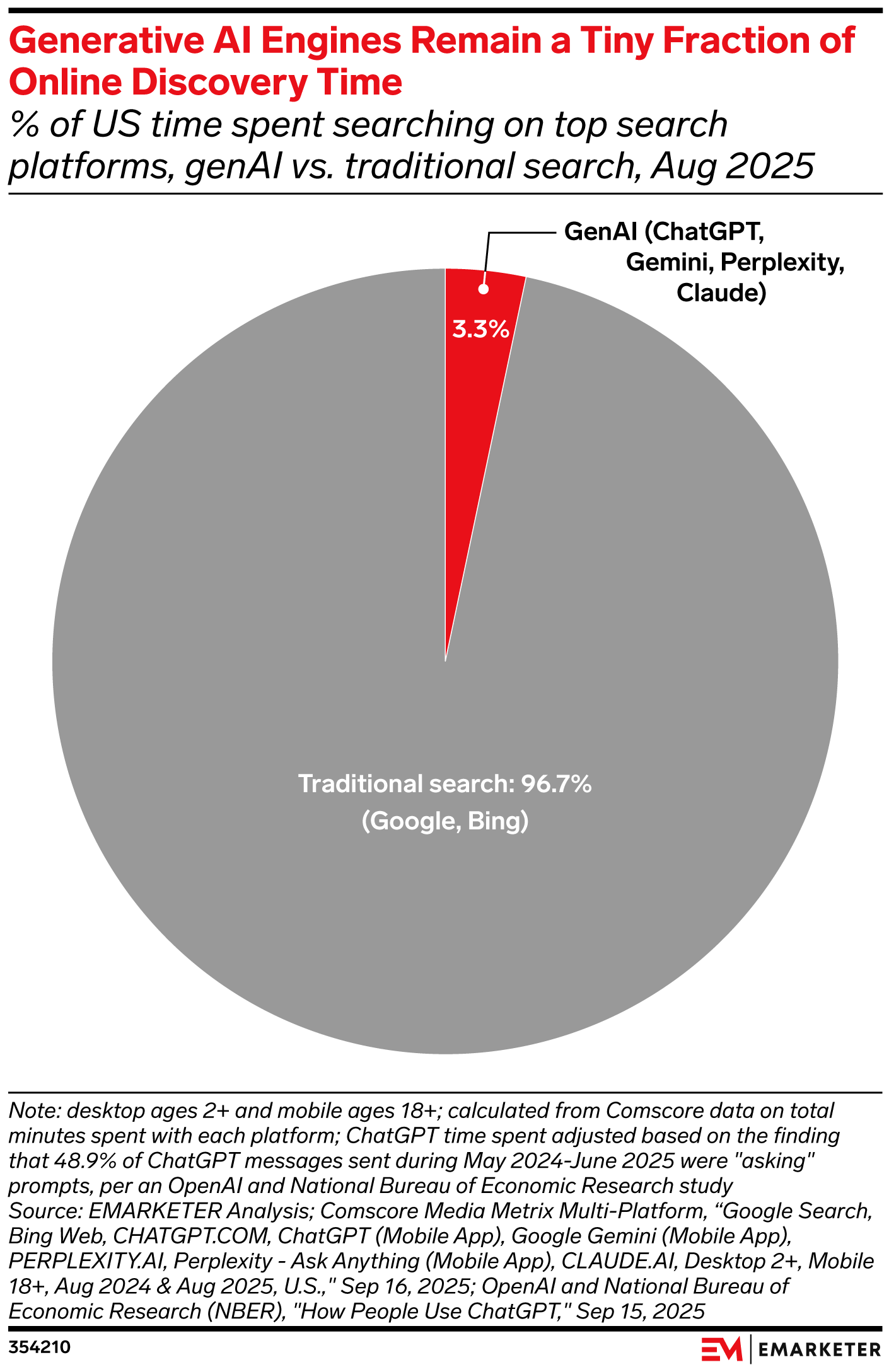 Key Stat: While generative AI engines will revolutionize search and discovery, today these tools account for just 3.3% of online discovery time in the US, per August 2025 Comscore data analyzed by EMARKETER.