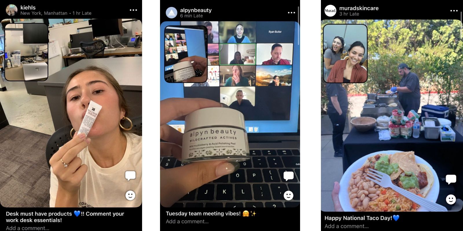Keep it interesting without curation. Laurie Lam, chief brand officer at e.l.f., says her brand shows glimpses of life at its headquarters along with “behind-the-scenes snapshots of hot product drops, photo shoots, and happy hour hangouts.” It’s that mix of activities that makes the experience more interesting for the brand’s BeReal friends and keeps them looking forward to future posts.