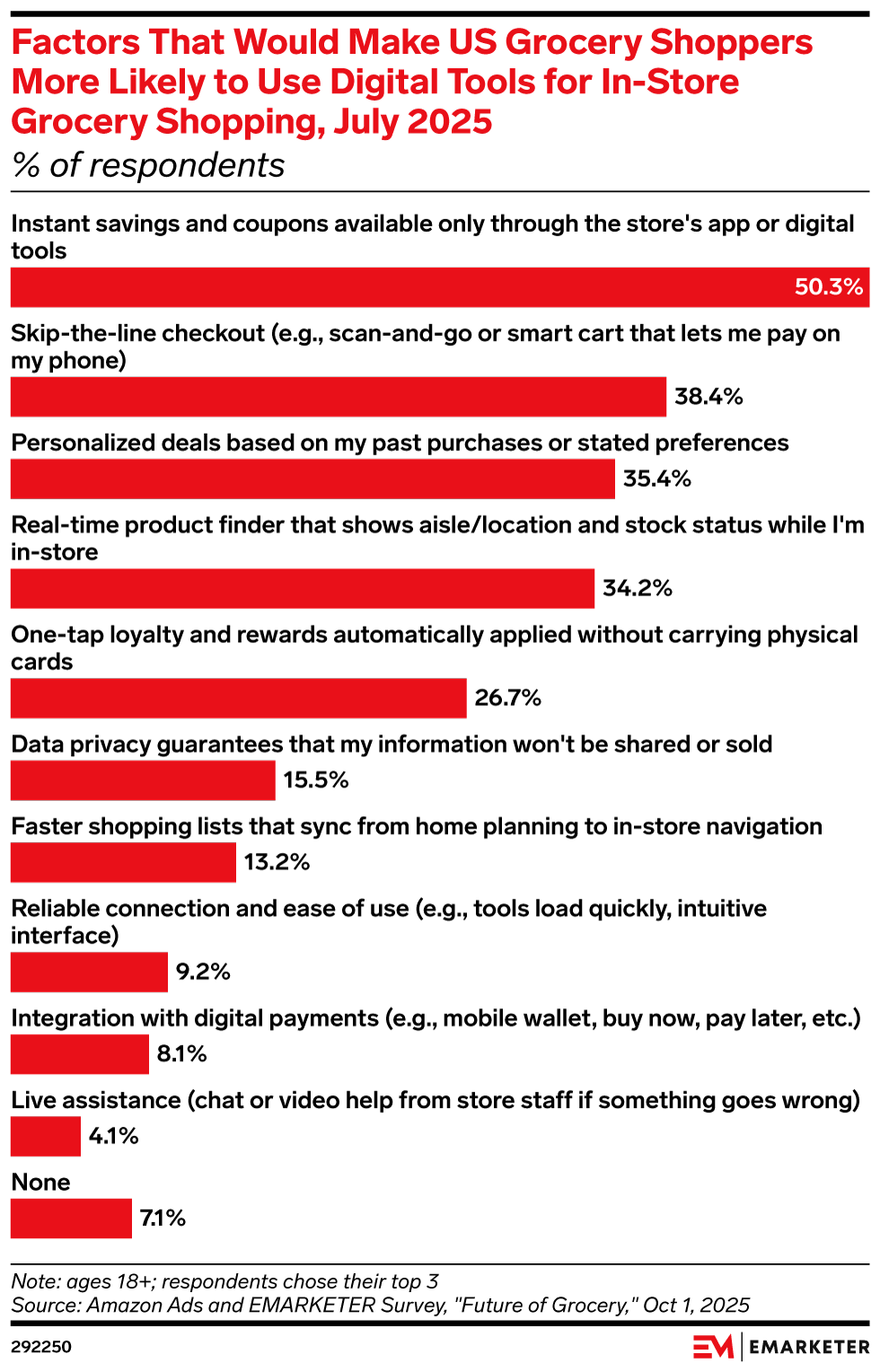 Key stat: 50.3% of US grocery shoppers say they'd use in-store digital tools if instant savings and coupons were exclusive to those tools, according to July 2025 data from Amazon Ads and EMARKETER.