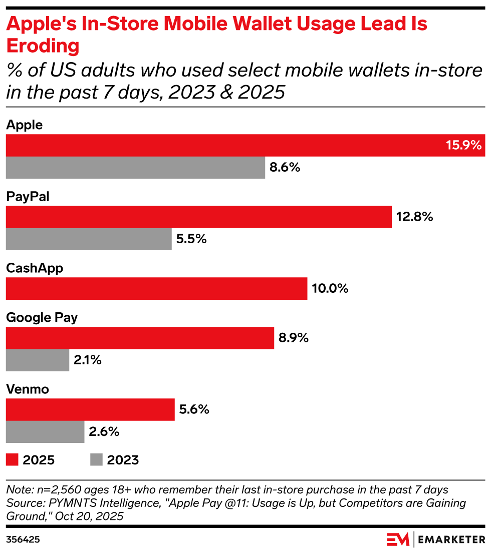 However, Apple Pay’s rivals are snapping at its heels. While Apple’s share of users nearly doubled from 2023 to 2025, PayPal, Cash App, and Google Pay all grew their share even faster.