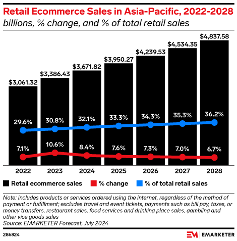 Key Stat: Retail ecommerce sales growth in Asia-Pacific will be in the single digits from 2024 to 2028. By 2025, ecommerce will account for a third of retail sales in the region.