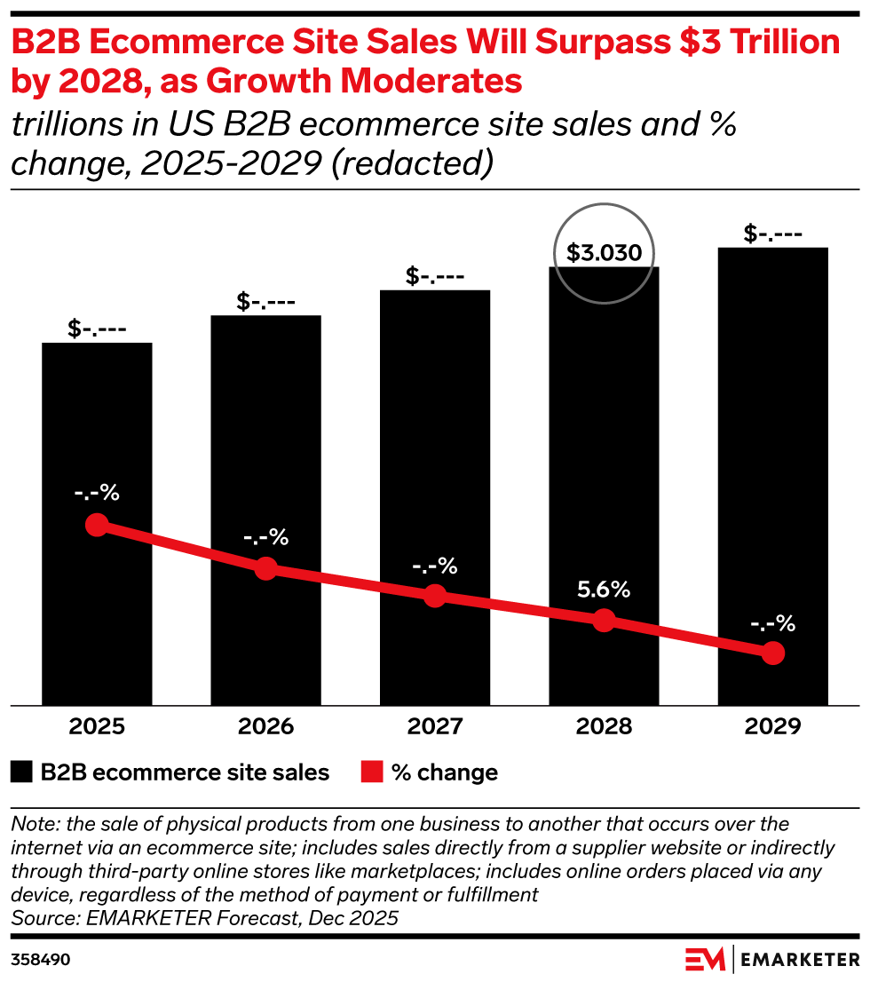 Key Stat: US B2B ecommerce site sales will rise steadily through the forecast period, surpassing $3.100 trillion by 2029.