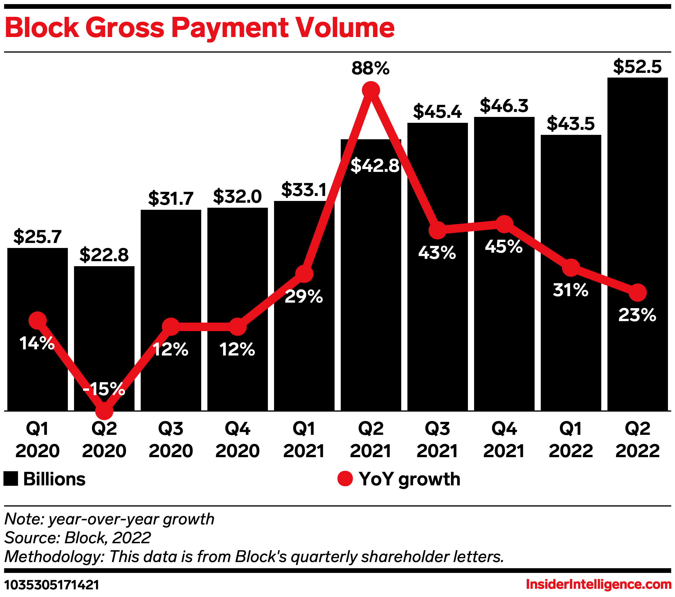 The data: Block’s gross payment volume (GPV) increased 23% year over year (YoY) in Q2, a slowdown from 88% YoY growth during the same period last year, per its shareholder letter. However, total net revenues fell 6% YoY compared with a 143% YoY increase in Q2 2021.