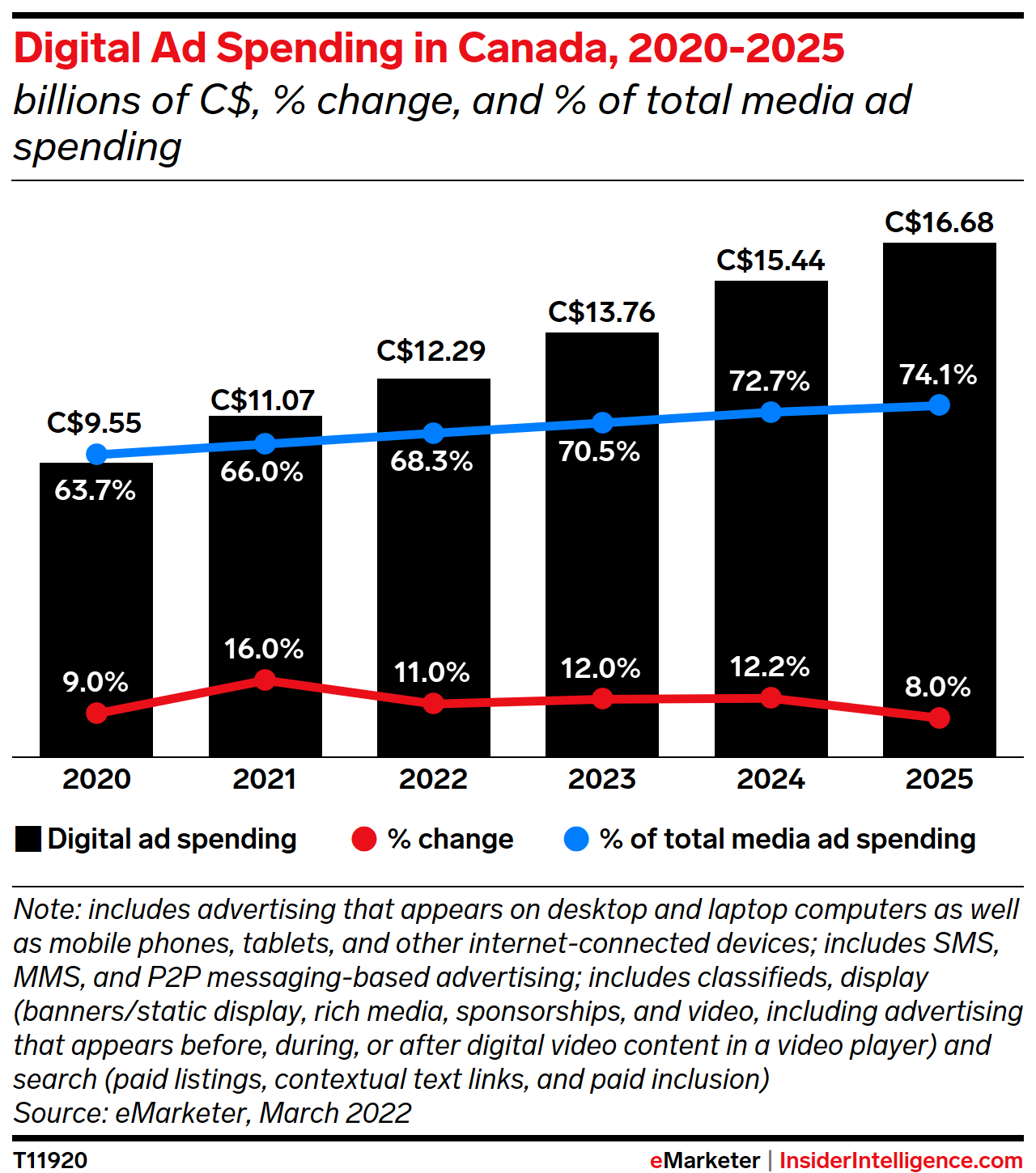 KEY STAT: This year, for the first time, digital ad spending will be more than double traditional ad spending, accounting for 68.3% of the total ad market in Canada.
