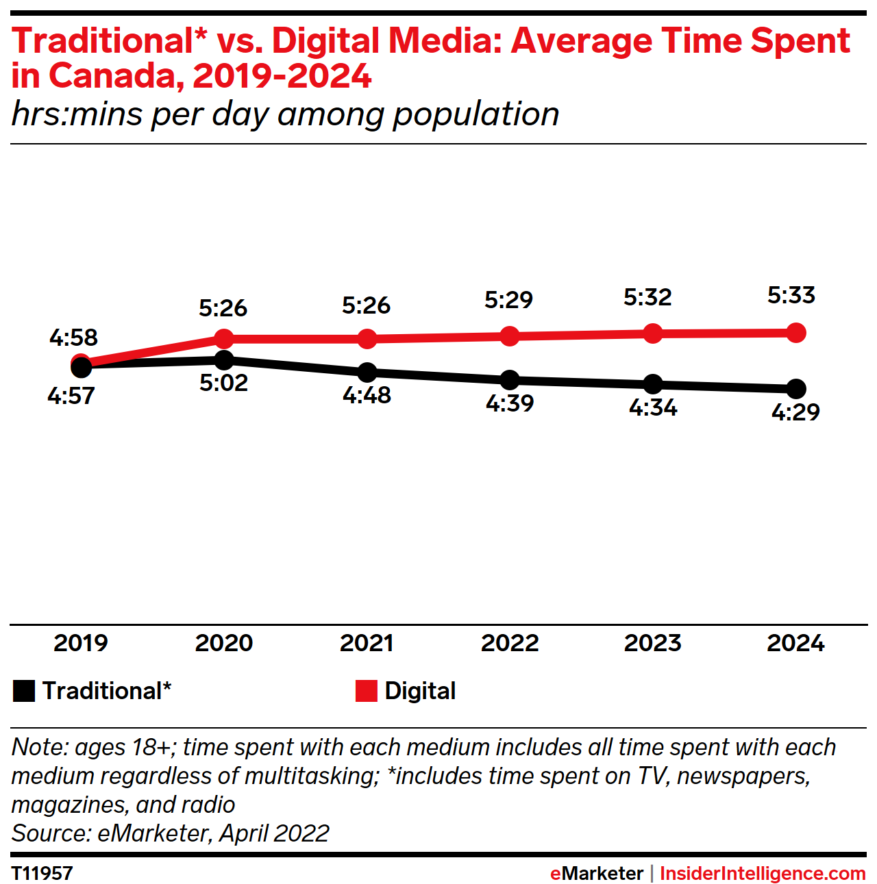 KEY STAT: Digital media time will be 5:29 daily on average in Canada this year, as the shift to digital continues apace.
