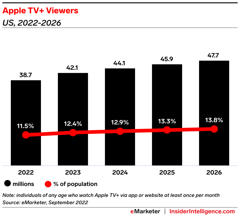 This year, Amazon Prime Video will amass 157.3 million US viewers, just over 13 million shy of Netflix’s 170.6 million. By contrast, Apple TV+ has just over 42 million.