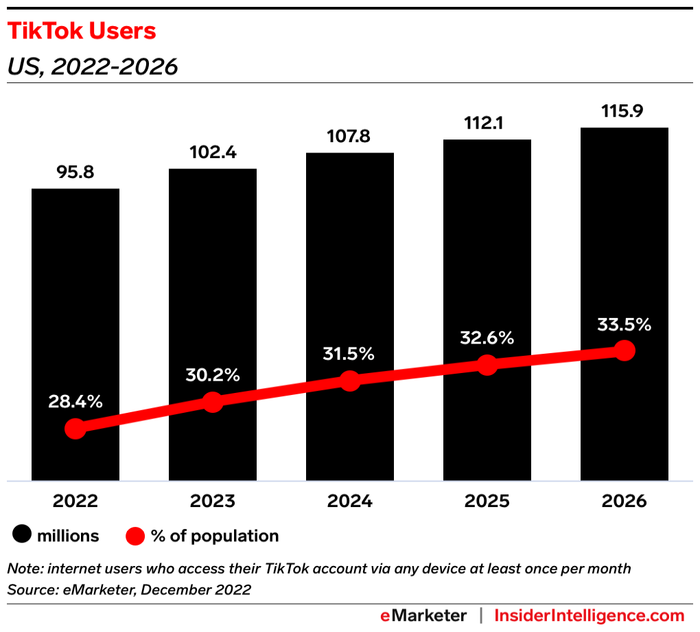 Why it’s worth watching: We estimated that 61.3% of Gen Z in the US use TikTok at least once a month. Additionally, 58% of American teenagers ages 13 to 17 visit TikTok at least once a day, and 16% access TikTok “almost constantly,” according to Pew Research Center.