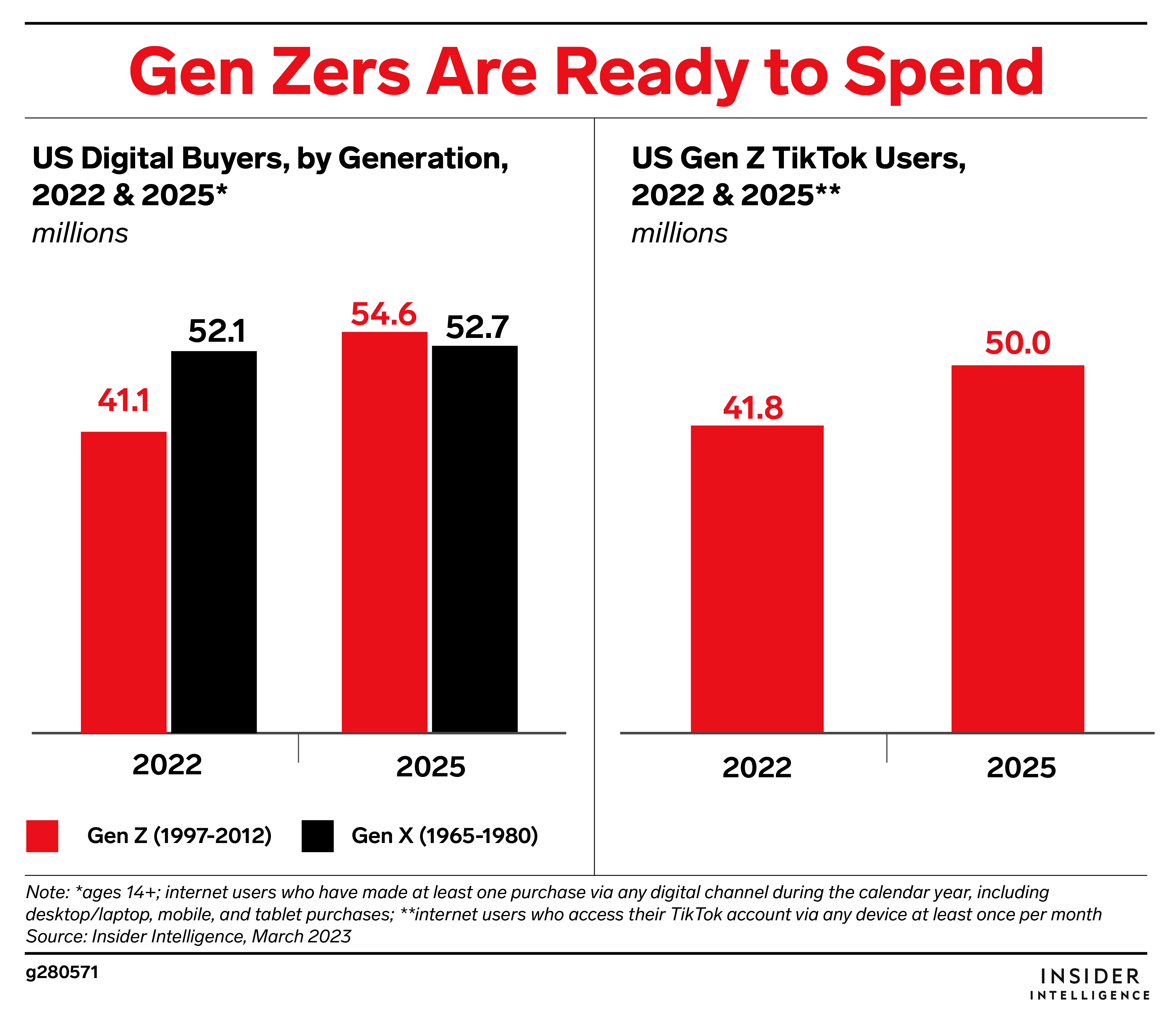 Gen Zers are ready to spend. The majority will be adults in 2023, meaning increased spending power. And they rely heavily on digital when making purchases: Gen Z will surpass Gen X in the number of US digital buyers by 2025, per our forecast.