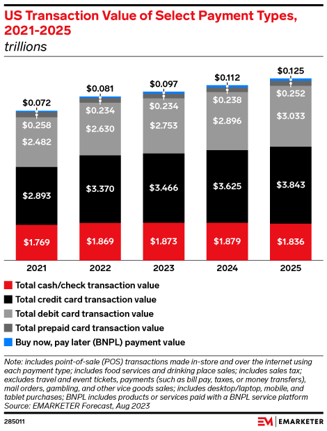 Key stat: Credit cards will remain the most popular retail payment method in the US through next year, with total credit card transaction value reaching $3.843 trillion in 2025, per our forecast.