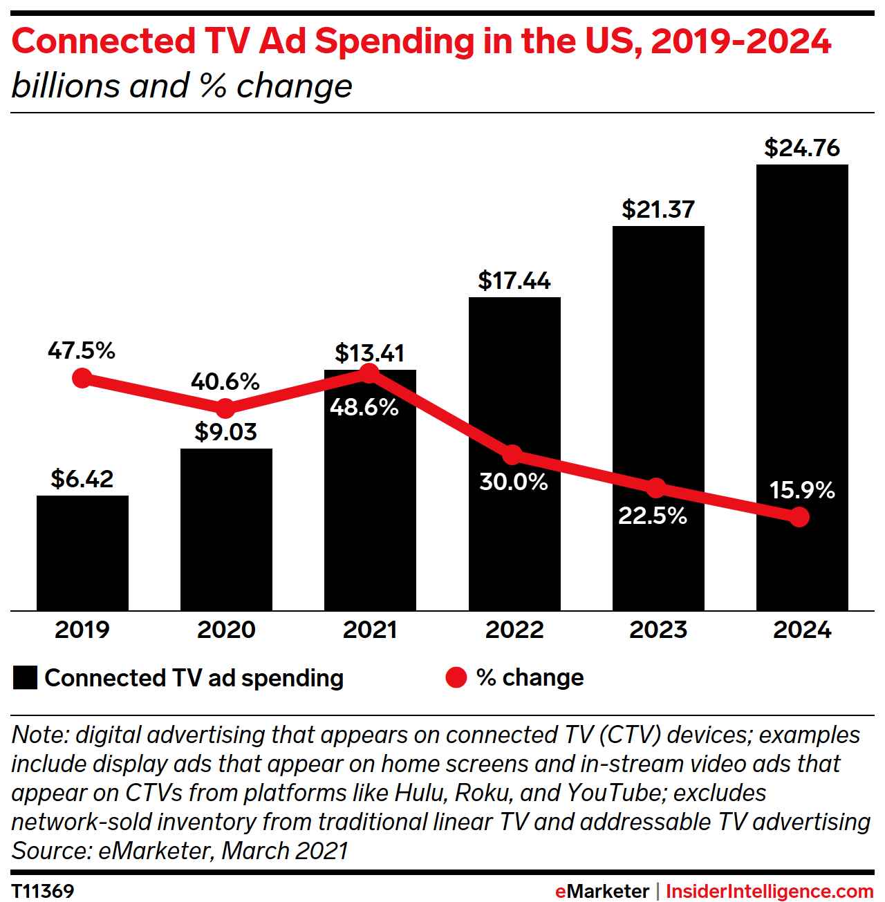 We estimate CTV investments in the US grew by 40.6% year over year in 2020, to more than $9 billion. Growth will accelerate this year as spending reaches $13.41 billion—a figure that will more than double by the end of our forecast period in 2025.