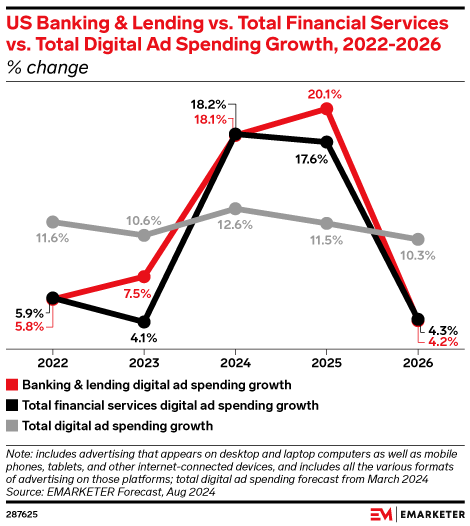 Click here to view our full forecasts for US banking and lending industry digital ad spending, US financial services industry digital ad spending, and US digital ad spending.