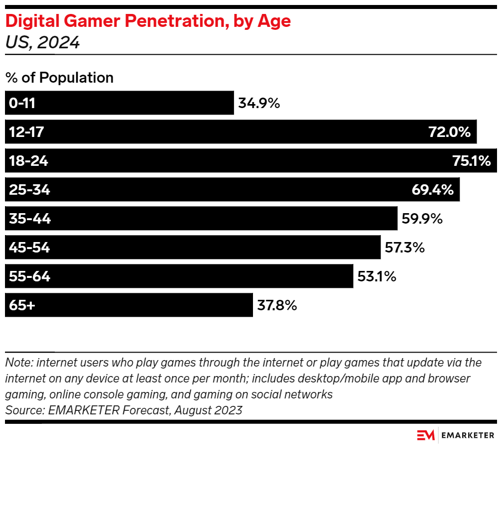 Gen Zers (ages 12 to 27) account for the largest share of US digital gamers (27%) in 2024, per our forecast. Much of this is driven by the 75.1% of Gen Zers ages 18 to 24 who play online (or on a device that updates online via the internet) at least once a month—the highest rate among the age groups we track. However, the average age of a video game player has increased from 29 in 2004 to 36 in 2024, according to ESA and YouGov. This is indicative of smartphones and apps making gaming more accessible to consumers of all ages over the past two decades, as well as how gamers continue to engage in the activity as they mature.
