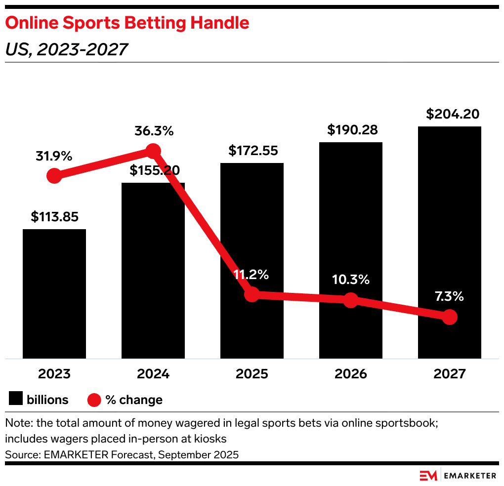 The amount wagered on apps and websites in the US will grow from $172.55 billion this year to $204.20 billion in 2027. YoY growth saw an uptick in 2024, the first full calendar year of legal online sports betting in Kentucky, Maine, Vermont, and Florida. North Carolina legalized the practice in March 2024, likely contributing to that bump. Growth will slow in 2025 but be somewhat buoyed by Missouri, which will become the 39th state with legal sports gambling on December 1, 2025.