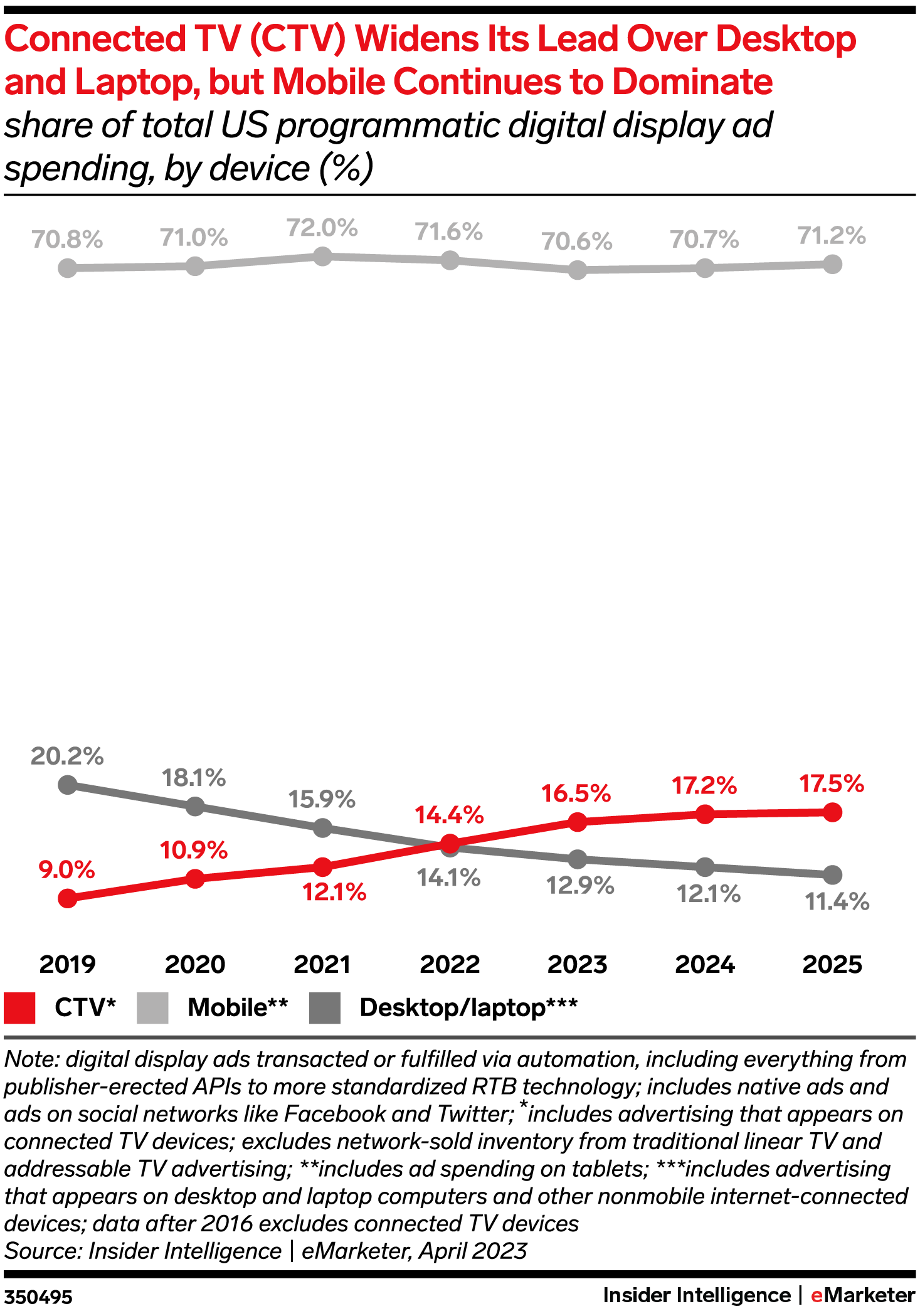 • But it’s still driving programmatic. CTV will grow more than three times as fast as mobile, and programmatic ad spending on desktop and laptop computers will be flat this year. In other words, despite its relatively small share of the total programmatic market, over 2 in 5 new programmatic ad dollars will go to CTV.