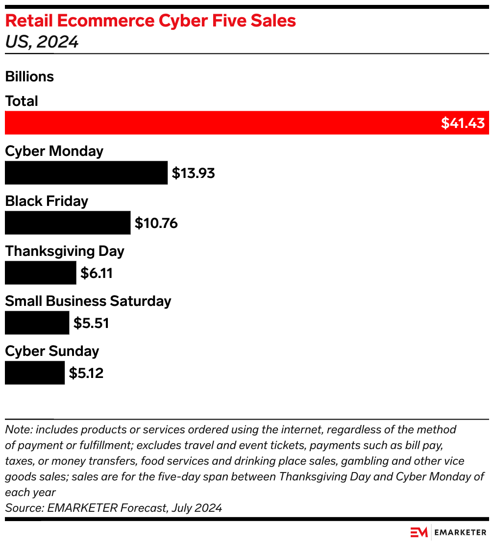 Even as the Cyber Five's share of overall holiday sales declines, the period remains vitally important. Cyber Monday and Black Friday will still be the two biggest online shopping days of the year: We expect Cyber Monday ecommerce sales will grow 7.8% YoY to $13.93 billion, and Black Friday ecommerce sales will increase 5.5% to $10.76 billion.