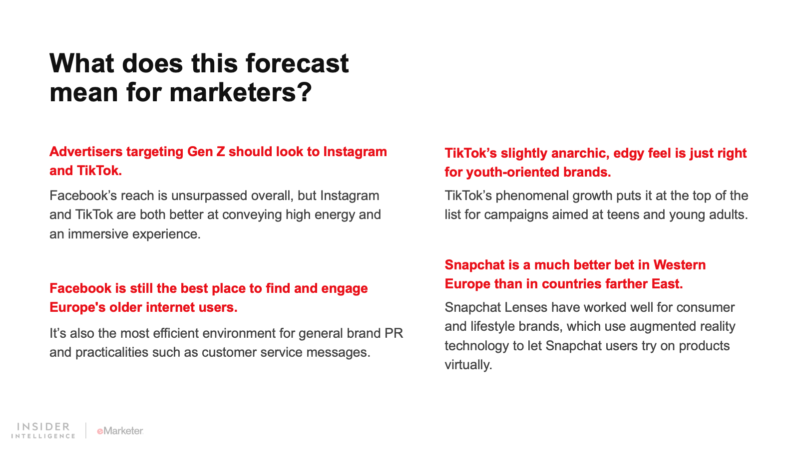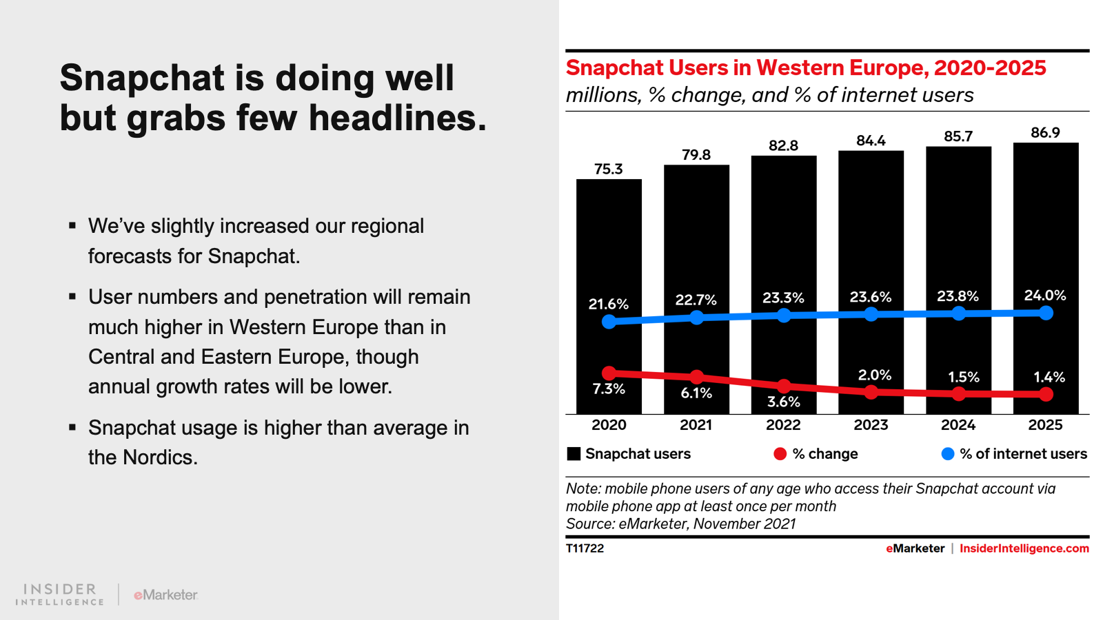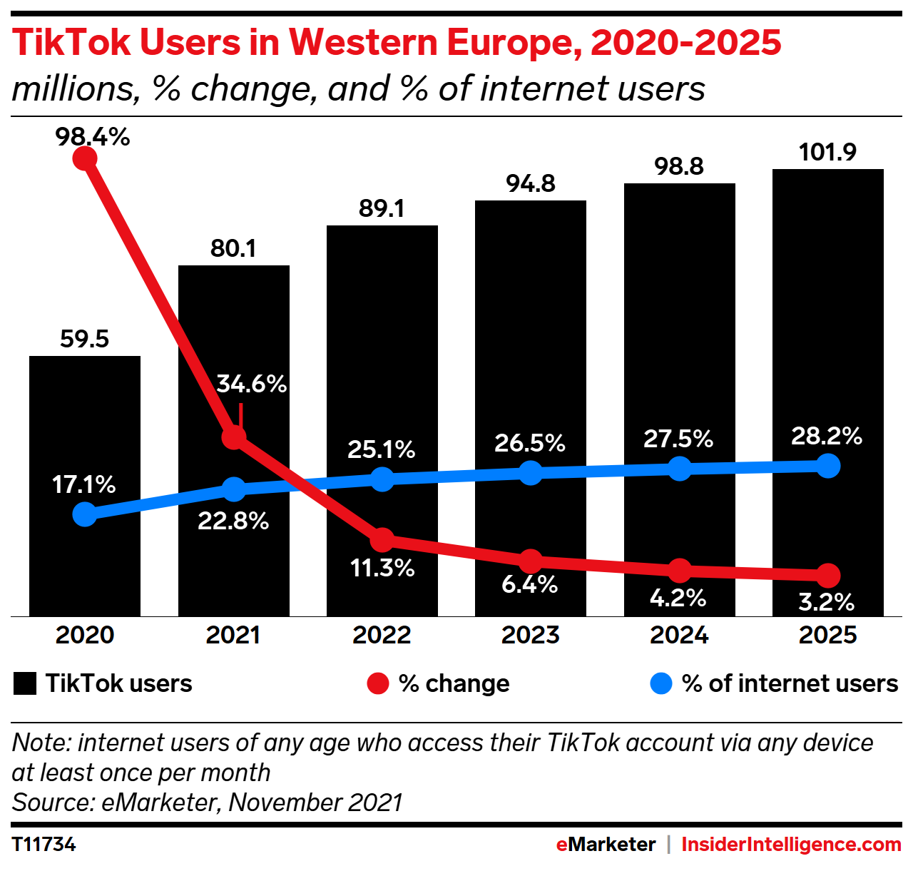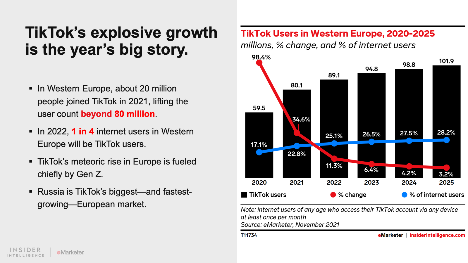 KEY STAT: One-quarter of Western Europe’s internet users will also use TikTok in 2022, pushing the platform’s user count beyond 89 million. Gen Z will continue to drive double-digit growth this year.
