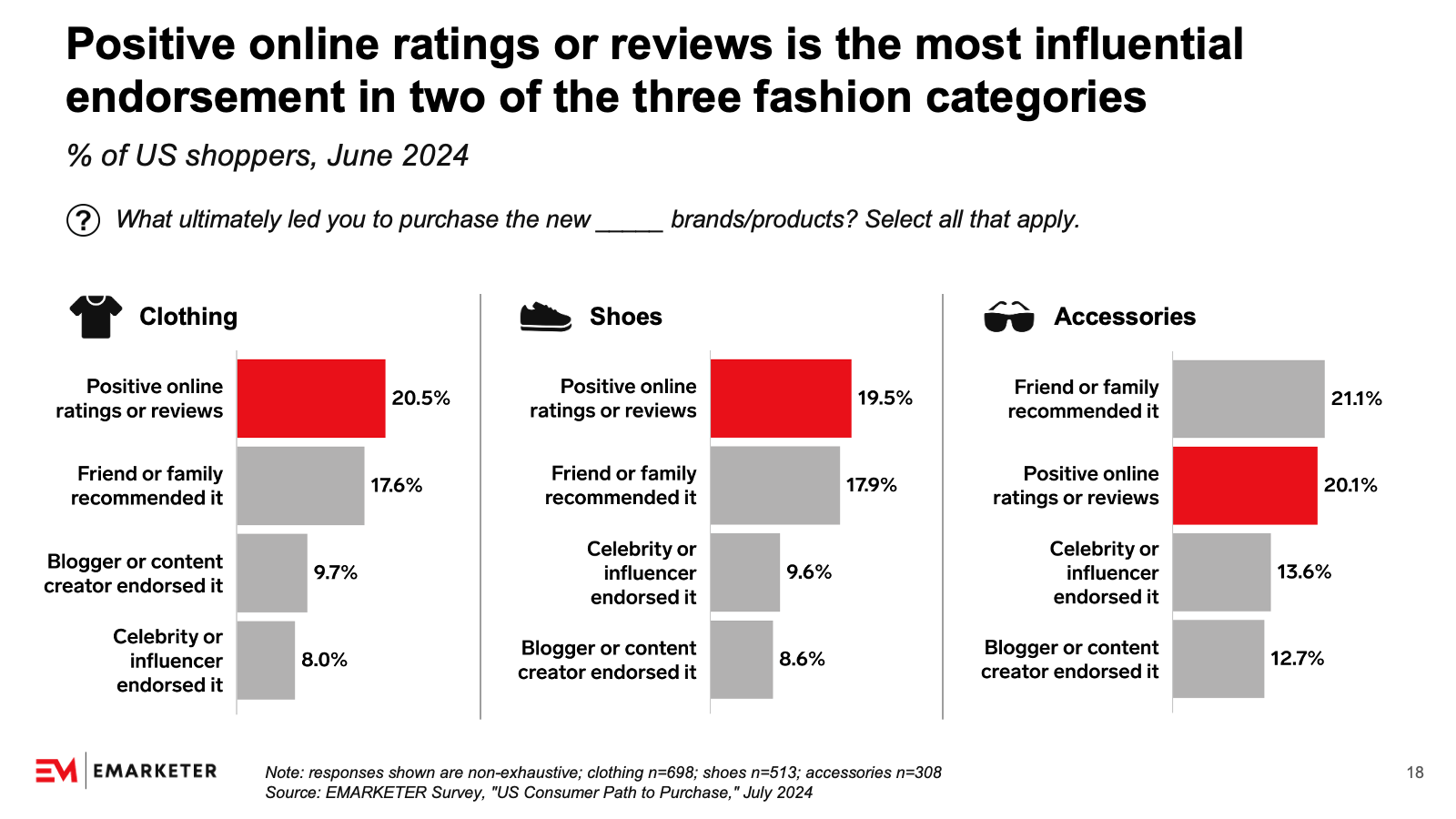 Positive online ratings or reviews are the most influential part of the path to purchase for clothing and shoes shoppers, according to our June 2024 survey. If shoppers trust reviews on retailers’ sites less, they will look elsewhere. “People are looking for conversational platforms to get ideas or read product reviews,” Strickland said.