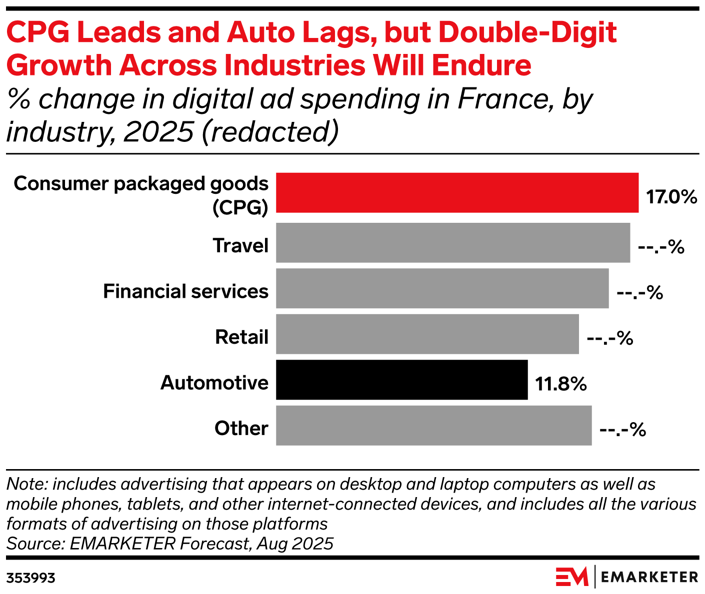 The digital ad industry in France is proving resilient despite economic and political instability. Every industry we track will post growth, albeit at different rates. For example, consumer packaged goods (CPG) will get a boost from the rise in retail media advertising, while weak demand for big-ticket items will slightly limit auto.