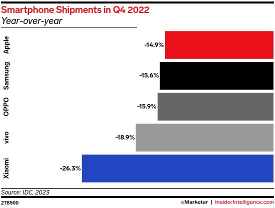 By the numbers: 1.21 billion smartphones were shipped in all of 2022, the lowest annual shipment total since 2013.