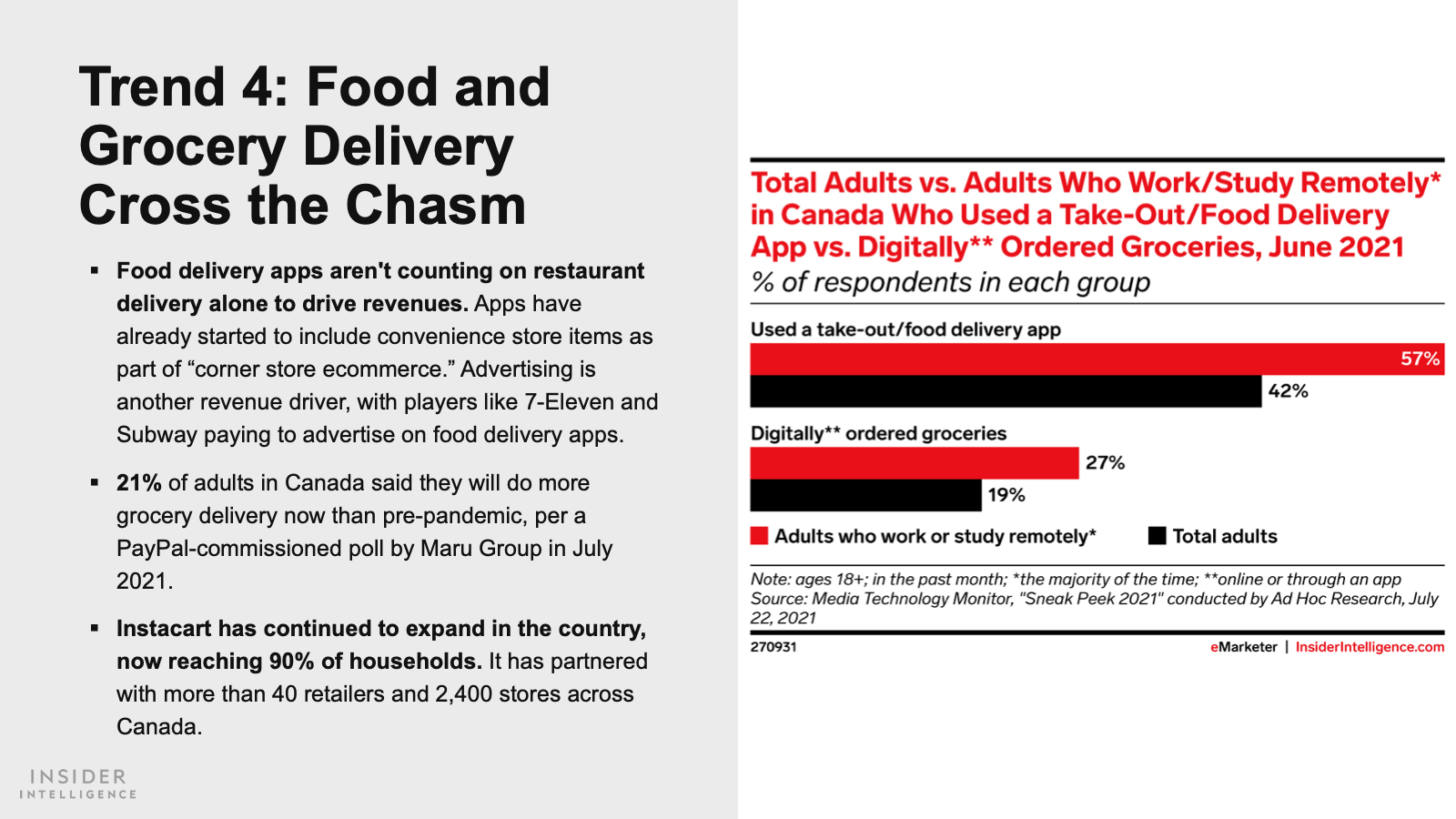 • As food delivery crosses the chasm into the mainstream, what are the opportunities for retailers, food service companies, and grocers?