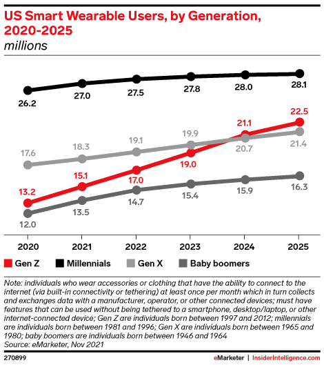 KEY STAT: Consumer adoption of wearables in the US will keep growing, across all generations, reaching 88.3 million wearable users in 2025.