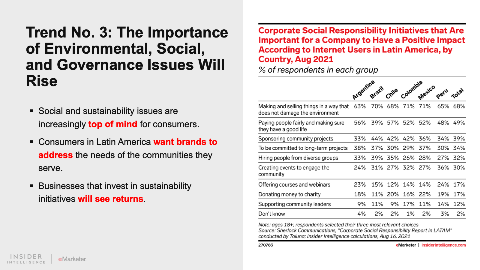 In Latin America in 2022, digital payments will make gains, consumer expectations around ecommerce will shift, corporate sustainability and social issues will come to the fore, SMBs will bank on social commerce, and retail media networks will make their presence felt.