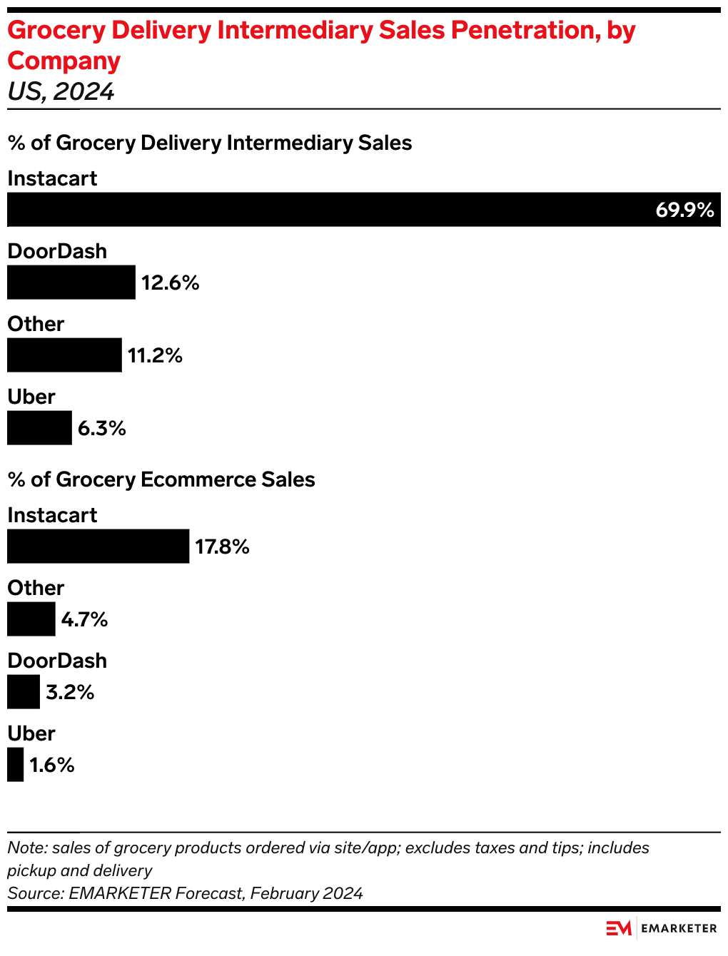 - And, most importantly for Instacart, it helps ward off the threat of DoorDash’s fast-growing grocery business. Our forecast expects DoorDash’s US grocery ecommerce sales to grow by 33.4% this year, handily outpacing Instacart’s 12.8% growth—although it should be noted that the former’s grocery sales are roughly one-fifth the size of the latter’s.