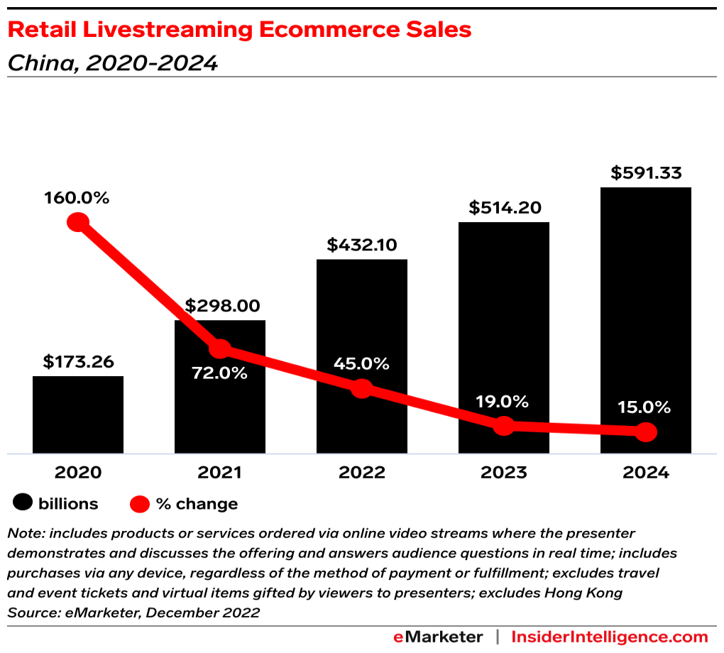 Livestream shopping isn’t resonating in the US: Livestream shopping in China soared over the last few years. We expect retail livestreaming ecommerce sales via apps like WeChat, Taobao Live, and Douyin (China’s version of TikTok) to reach $514.20 billion this year.