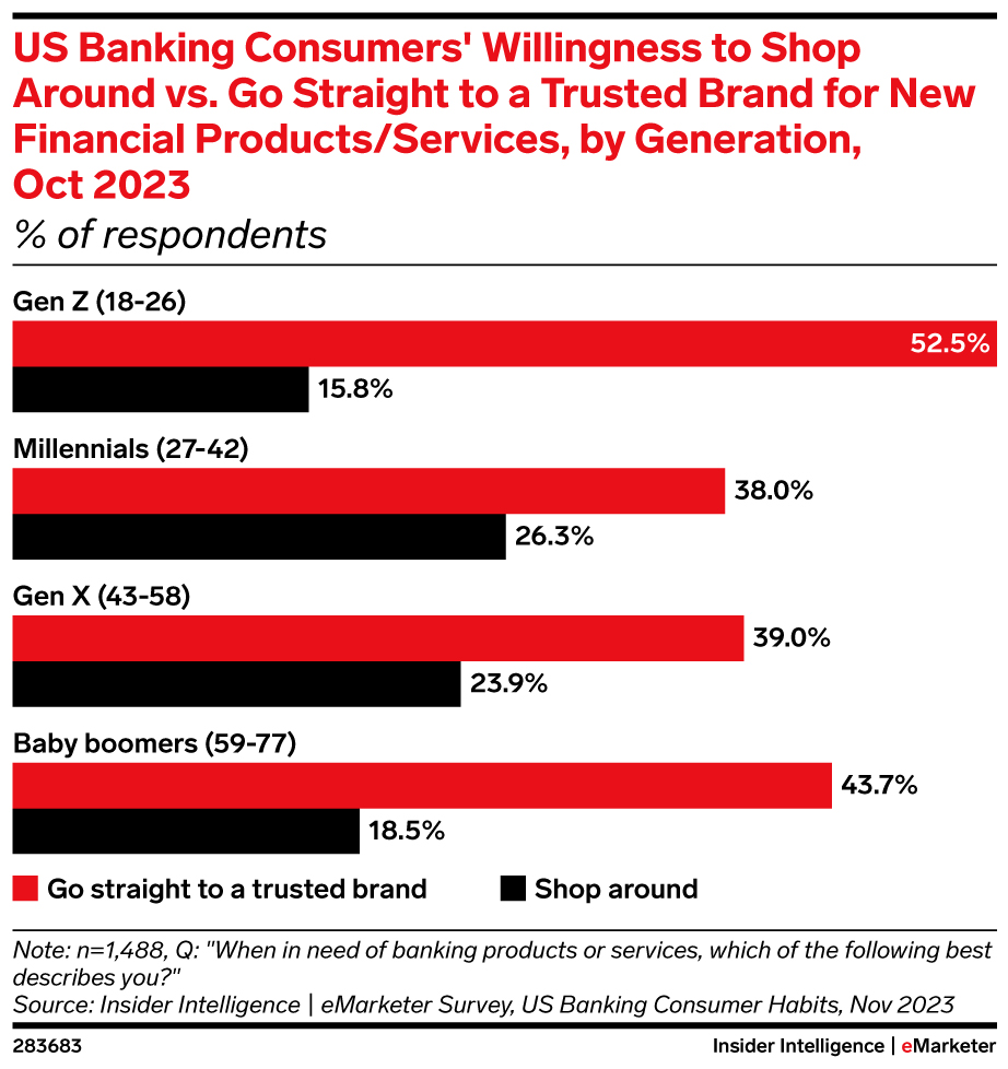 - Gen Zers were the most likely to seek financial advice from their FIs, at 56.3%. Millennials were the least likely (29.5%). All generations were most likely to turn to family and friends, but at least 69% respondents across all generations said they’d trust advice from their bank.