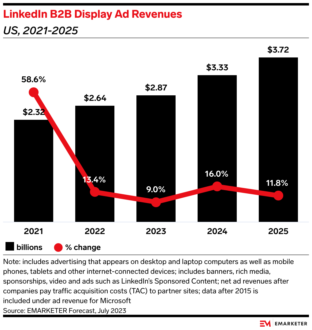 • Display revenues, which include video, are projected to outpace overall growth at 16%. However, there could be additional upside if LinkedIn continues to embrace video in a brand-safe way.