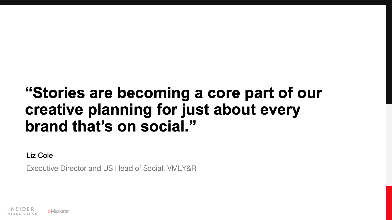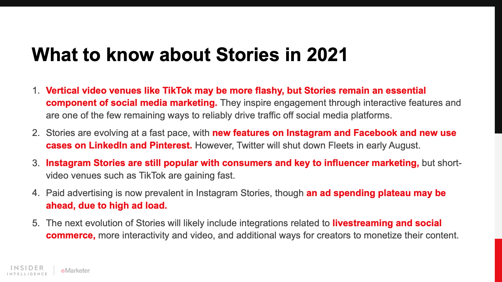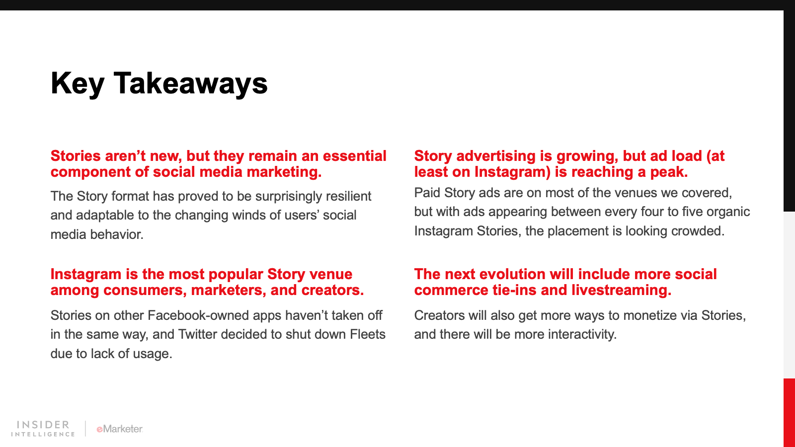 We expect Instagram and its siblings will bring more social commerce features to Stories. We also foresee more video and interactivity. The rise of short-form video is something to keep an eye on, but we believe the uniqueness of the Story format will help it solidify its place as an important venue for social media marketing.