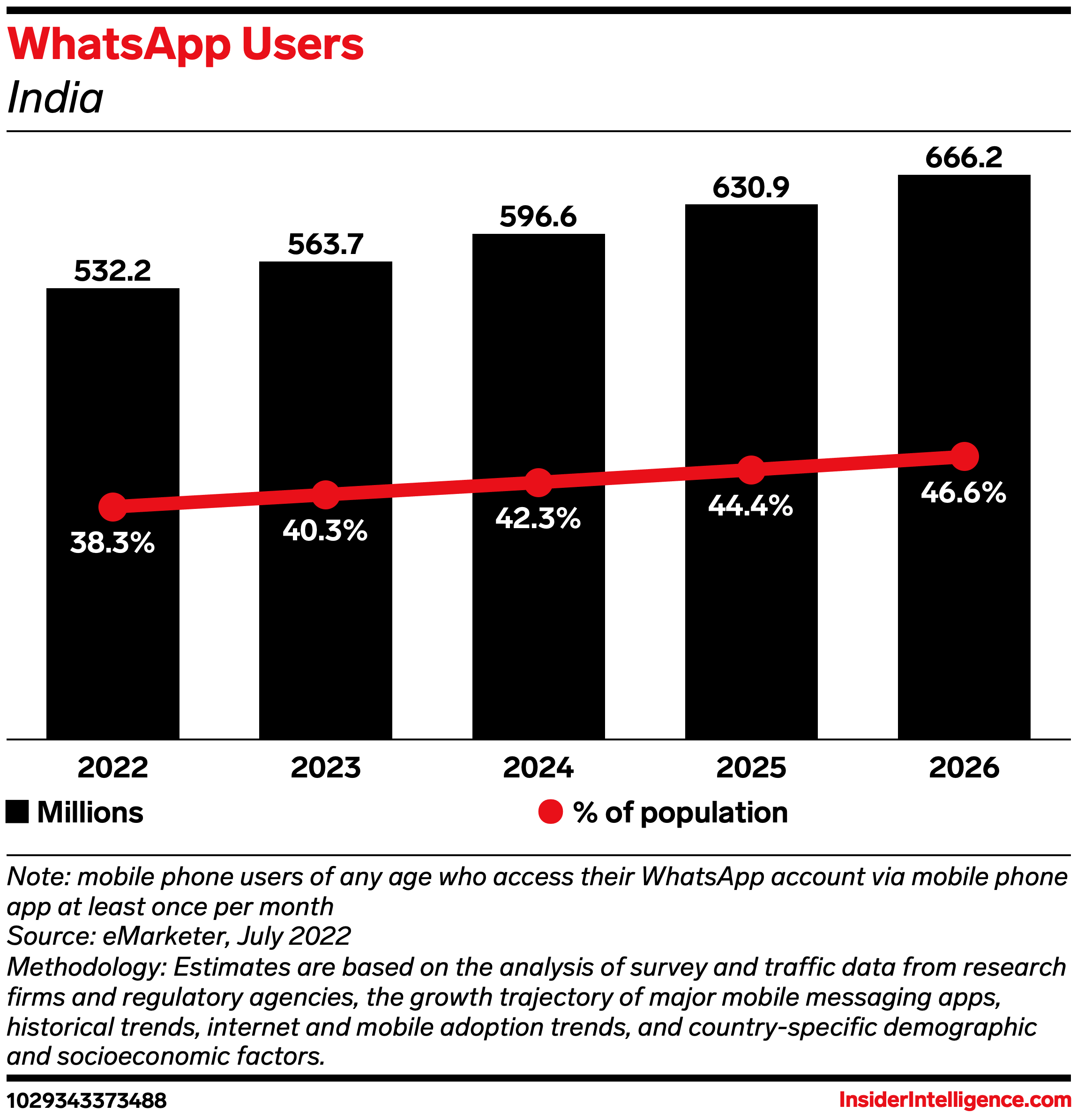 Meta gained approval this year to expand WhatsApp’s payments business from 40 million users to 100 million users—a small share of the 532.2 million people expected to use WhatsApp in 2022, per Insider Intelligence forecasts, making India WhatsApp’s largest market.