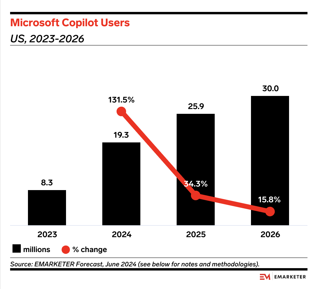 Copilot’s user count grew 131.5% YoY to 19.3 million in 2024, per our forecast. We expect that user growth to drop to 15.8% YoY in 2026.