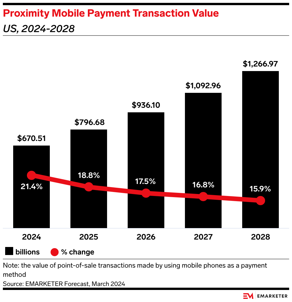 Key stat: Proximity mobile payment transaction value will increase by 21.4% this year and by double digits through the end of our forecast in 2028.