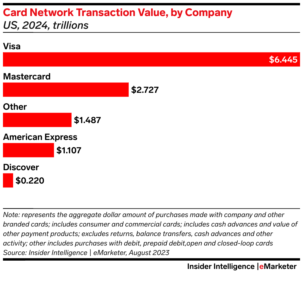 - Revenues among the Big Four US card payment networks topped $129 billion in 2023. They’re in the business of making money, unlike ACH networks and FedNow. Visa and Mastercard earn network fees from other parties to the transaction. American Express and Discover network operators also earn revenues via direct acquiring relationships with merchants and issuing their own cards. All four also earn revenues from value-added services.