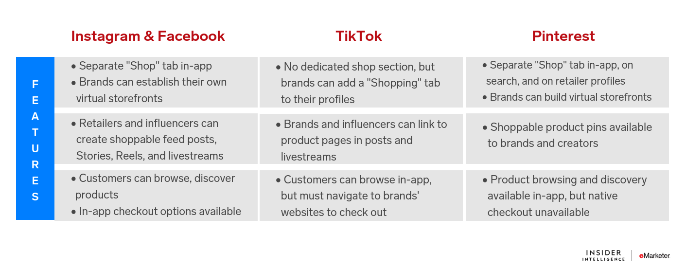 Compare and contrast: Instagram and Facebook lead the pack in features like in-app checkout, but TikTok and Pinterest are leveraging their strength in product discovery to deliver value to retailers.