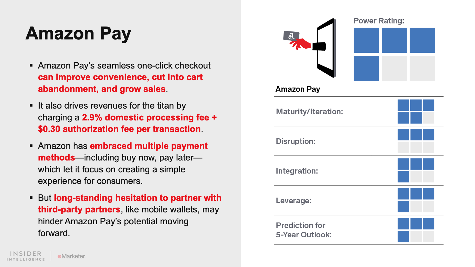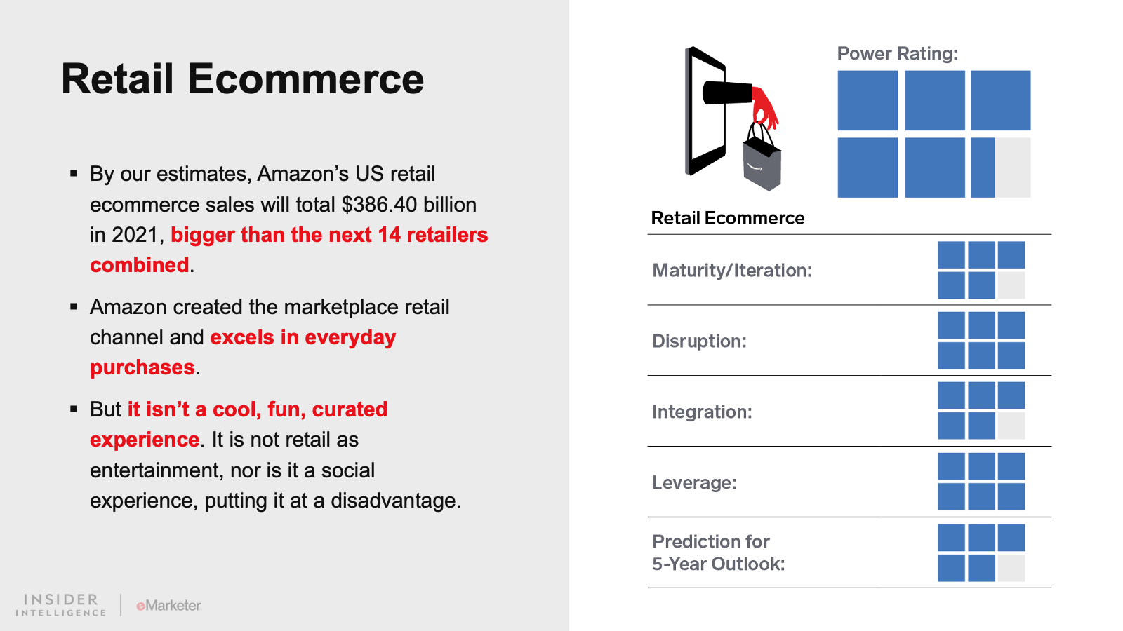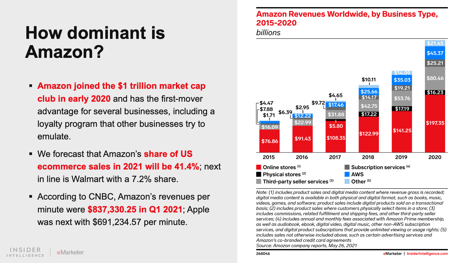 Amazon joined the $1 trillion market cap club in early 2020 and has the first-mover advantage for several businesses, most notably as a commerce platform and a marketing powerhouse. It also created a loyalty program that other businesses now try to emulate. We forecast that Amazon’s share of US ecommerce sales in 2021 will be 41.4%; next in line is Walmart with a 7.2% share. According to CNBC, Amazon’s revenues per minute were $837,330.25 in Q1 2021; Apple was next with $691,234.57 per minute.
