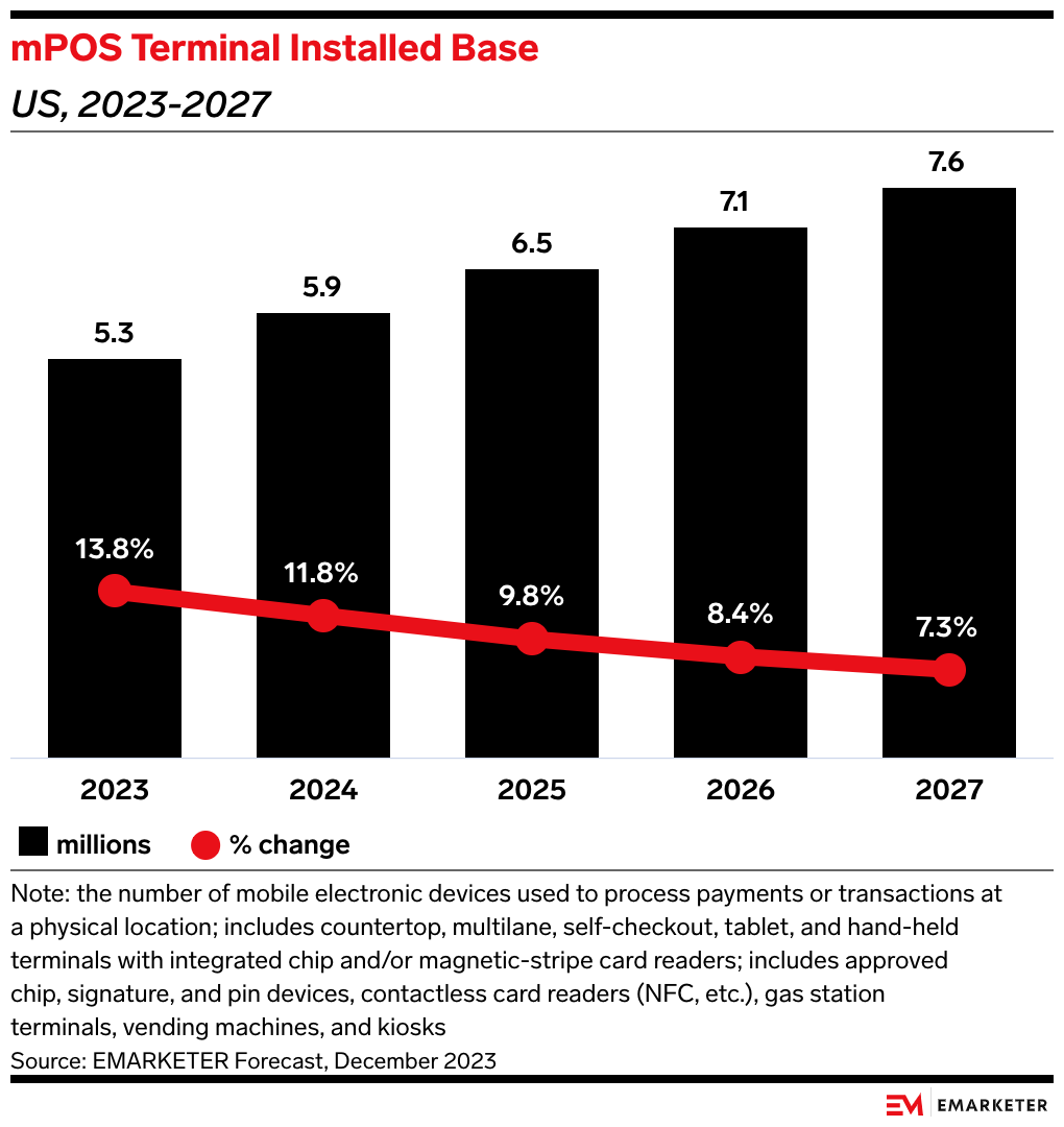 Key Stat: The US installed base of mobile point-of-sale (mPOS) terminals will grow at more than five times the rate of in-place hardware from 2023 to 2027, per our forecast. The role of mPOS in completing transactions at the customer's location continues to increase.