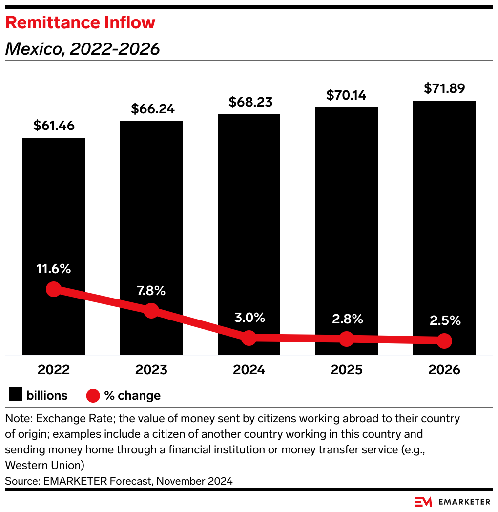 Our take: Remittances present a massive volume opportunity for payment providers. We forecast global remittance inflows will reach $901.30 billion in 2025, growing 3.1% YoY.