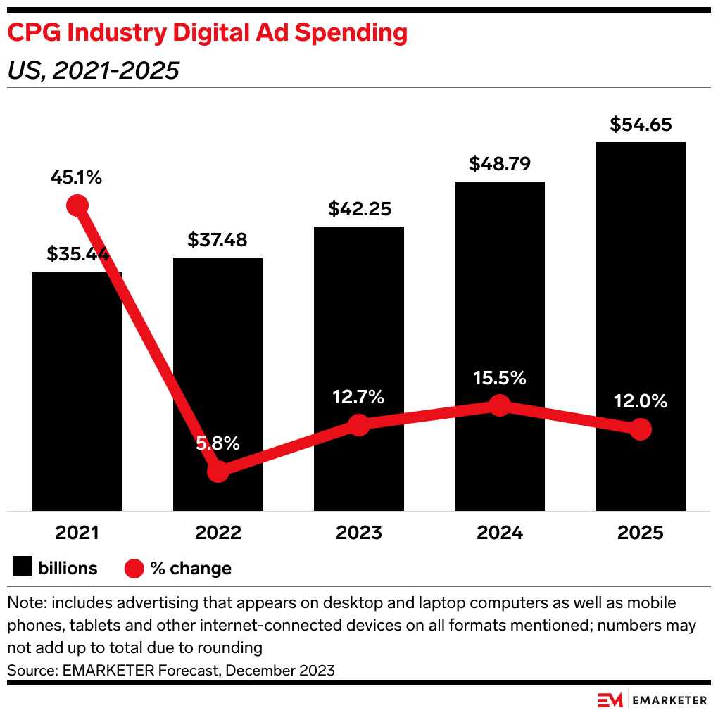 The dynamic: We expect CPG digital ad spending in the US to grow 15.5% this year to $48.79 billion, the fastest growth rate in three years. While retail media won’t get all of those dollars, the steady flow of CPG ad budgets to retailers like Walmart and Kroger is giving suppliers more negotiating room during price talks.
