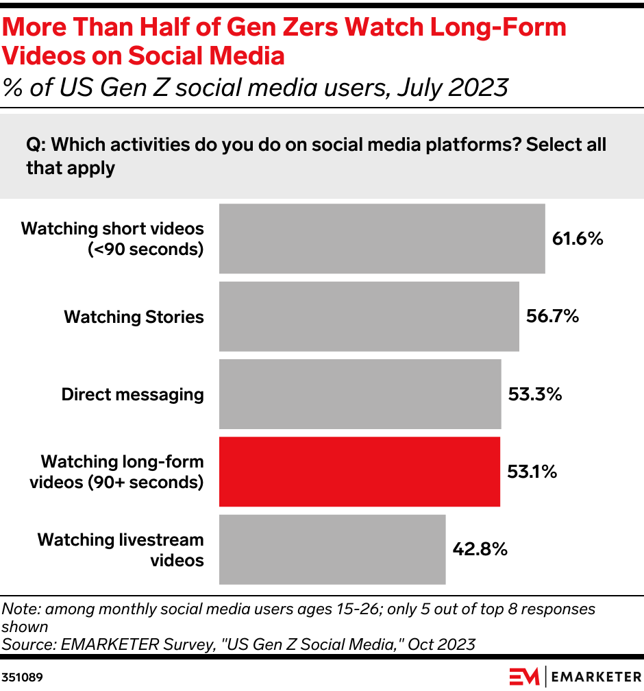 Key Stat: More than half (53.1%) of Gen Zers watch long-form videos—those that are 90 seconds or longer—according to our July 2023 survey.