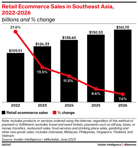 KEY STAT: Retail ecommerce sales growth in Southeast Asia will slip from 21.6% in 2022 to 13.5% in 2023, with a gradual ease into single-digit territory in 2025.