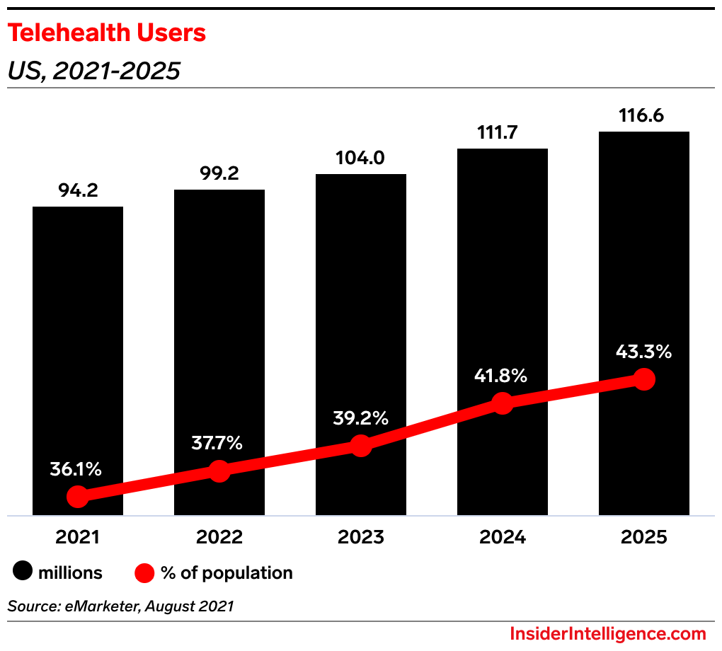 Teladoc has also received industry praise for its robust telehealth capabilities. And although telehealth has experienced a drop-off after the beginning of the COVID-19 pandemic, we expect the number of telehealth users to grow to 116.6 million in 2025 versus 99.2 million in 2022, according to our Telehealth Users forecast.