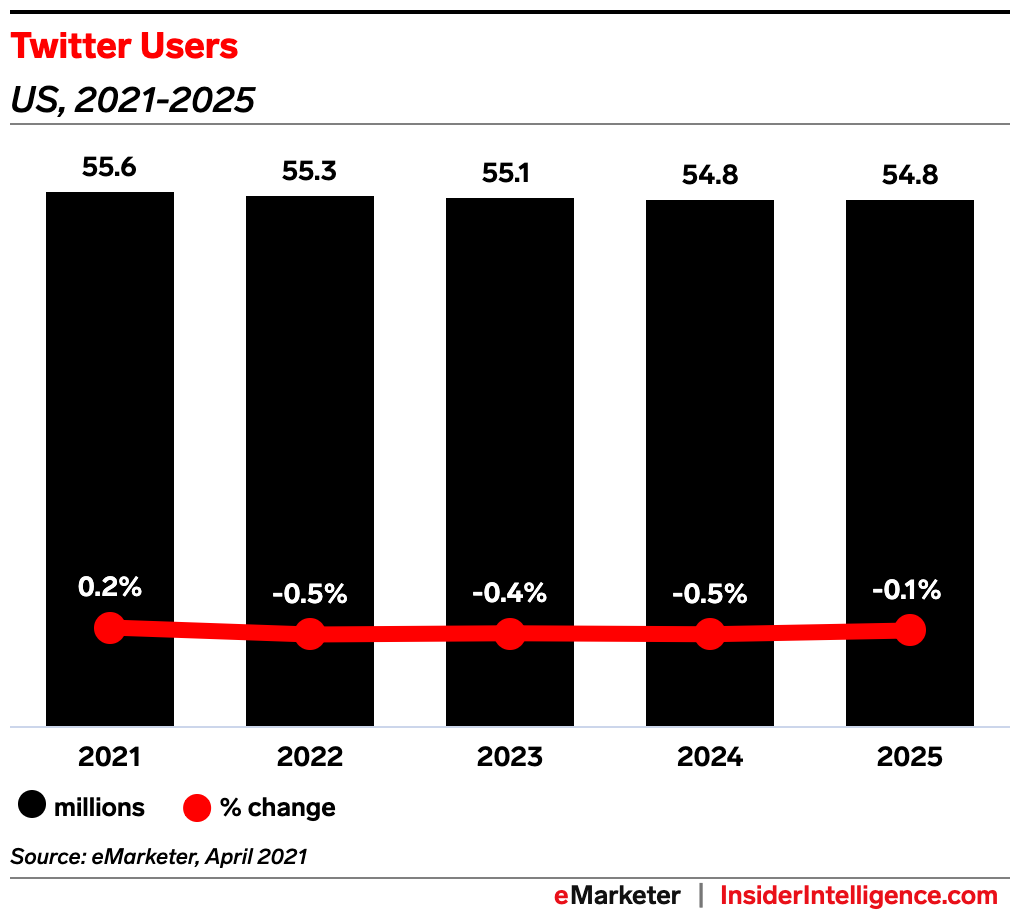 Key stat: While Twitter’s monthly user base in the US will increase by 0.2% this year to 55.6 million, we expect those figures to begin inching downward next year. The number of global monthly users, however, will continue to climb slowly through 2025.