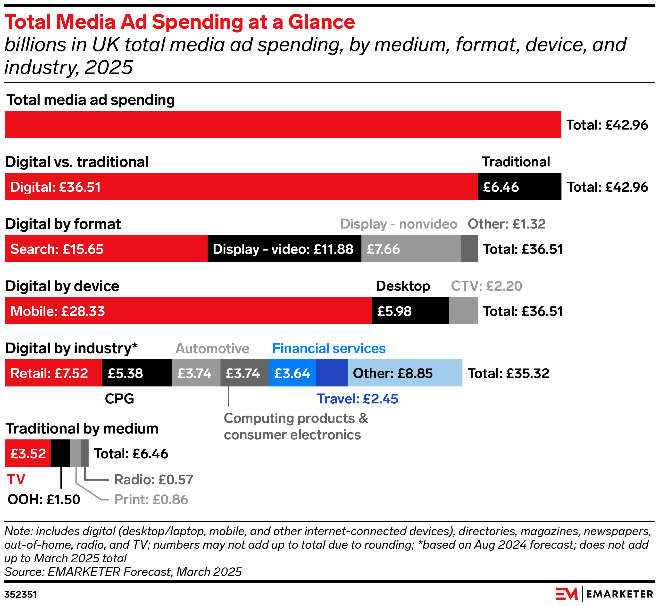 This is EMARKETER’s H1 2025 “UK Ad Spending Benchmarks.” In each edition of this series, we look at the latest forecasts for total media ad spending and digital ad spending by format, device, and channel, with a deck dedicated to programmatic. Each deck in this series gives marketers the data they need to benchmark their own spending.