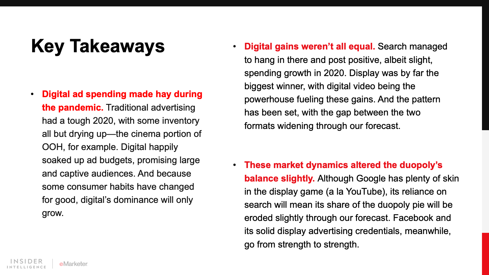 Digital display advertising, and particularly video, benefited from the pandemic. Search, on the other hand, struggled as some of the largest budget holders were forced to pull back spend (travel, for example). This has led to Facebook gaining some ground on Google in terms of the duopoly’s ad revenue share. This year, Google will account for 39.6% of total digital ad spend, and Facebook will account for 28.9%. In 2019, those proportions stood at 40.1% and 24.9%, respectively.