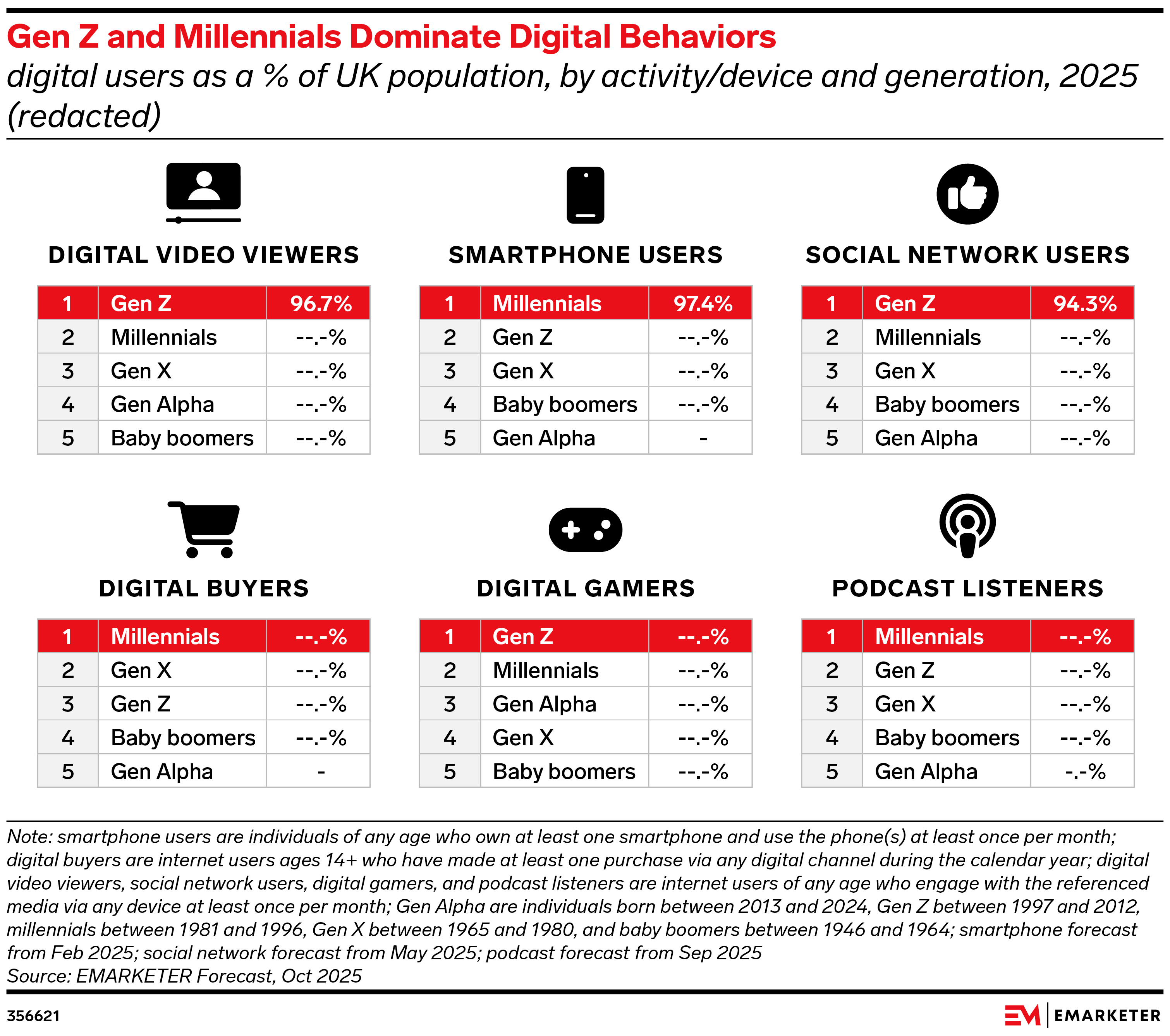Key Stat: Gen Zers and millennials dominate most digital behaviors, with Gen Z leading the charge for digital video at 96.7% penetration.